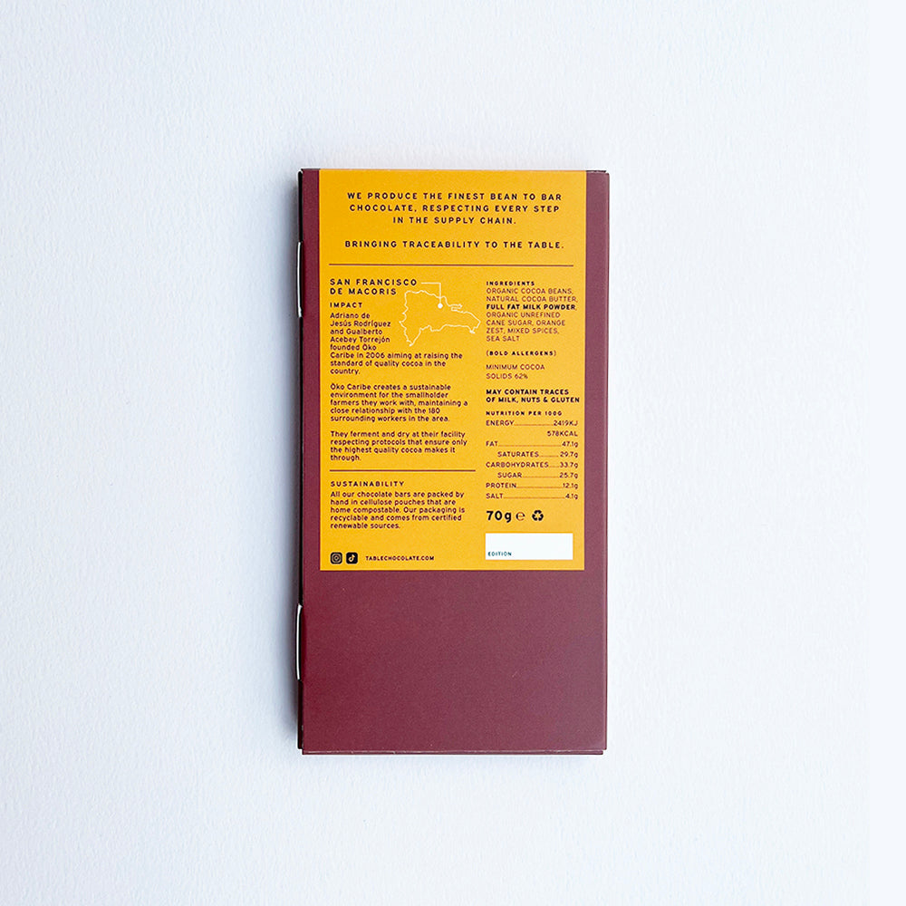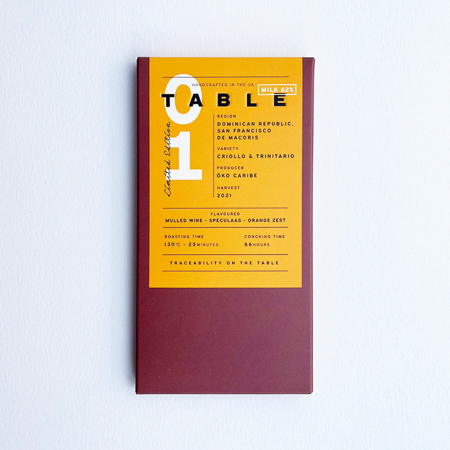 TABLE’S 1ST LIMITED EDITION FLAVOURED BAR. CHRISTMAS THEMED. MADE WITH ORGANIC COCOA BEANS FROM ÖKO CARIBE, DOMINICAN REPUBLIC WITH FLAVOURS OF MULLED WINE, SPECULAAS SPICES, DRIED ORANGE ZEST AND BLACKTHORN SEA SALT.